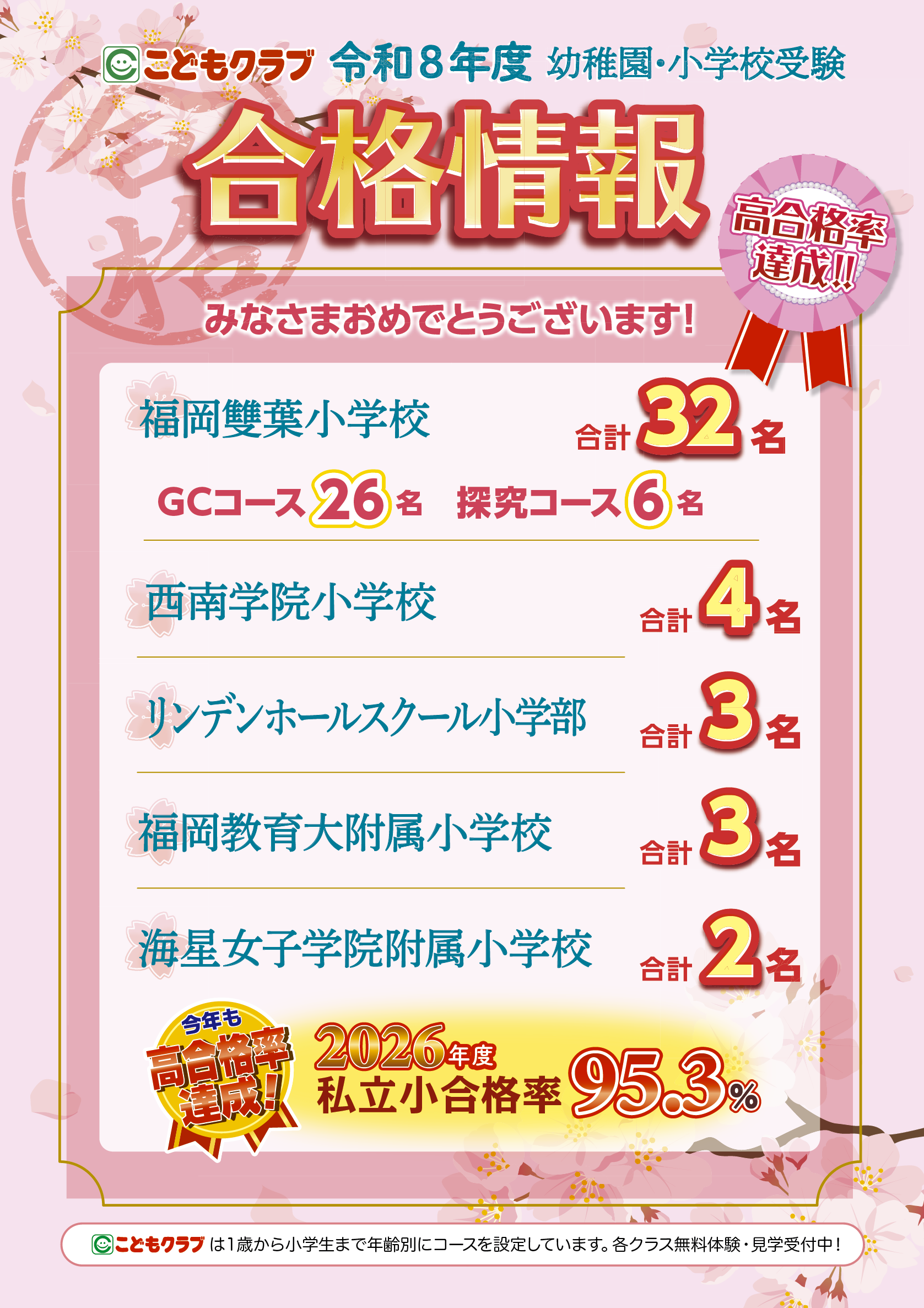 こどもクラブ・福岡薬院教室・福岡西新教室・福岡香椎教室から2026年度受験合格の速報が届きました!