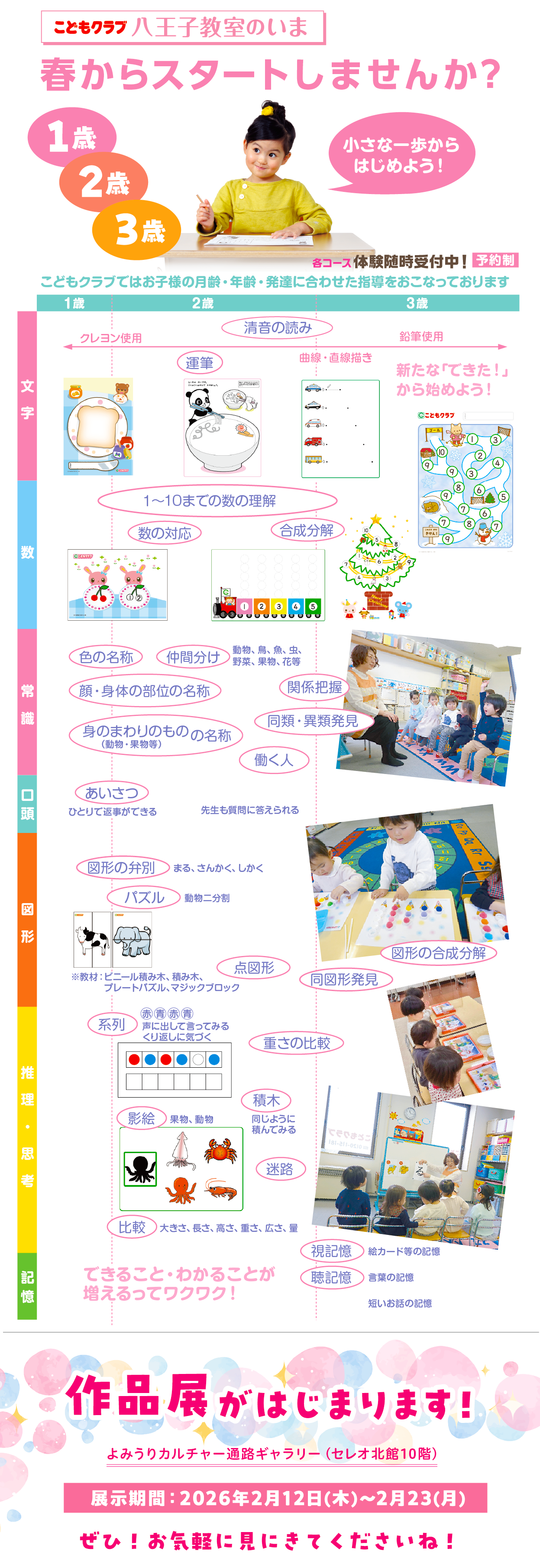JR八王子、京王八王子駅より徒歩2分。こどもクラブ八王子教室は開設から44年の歴史ある教室です。生後6ヶ月の赤ちゃんから中学生まで多くのお子様が集まる活気あふれる教室です。「もっと学びたい!」「もっとやりたい!」と子どもたちが目を輝かせ、意欲的に取り組めるような指導を心がけております。