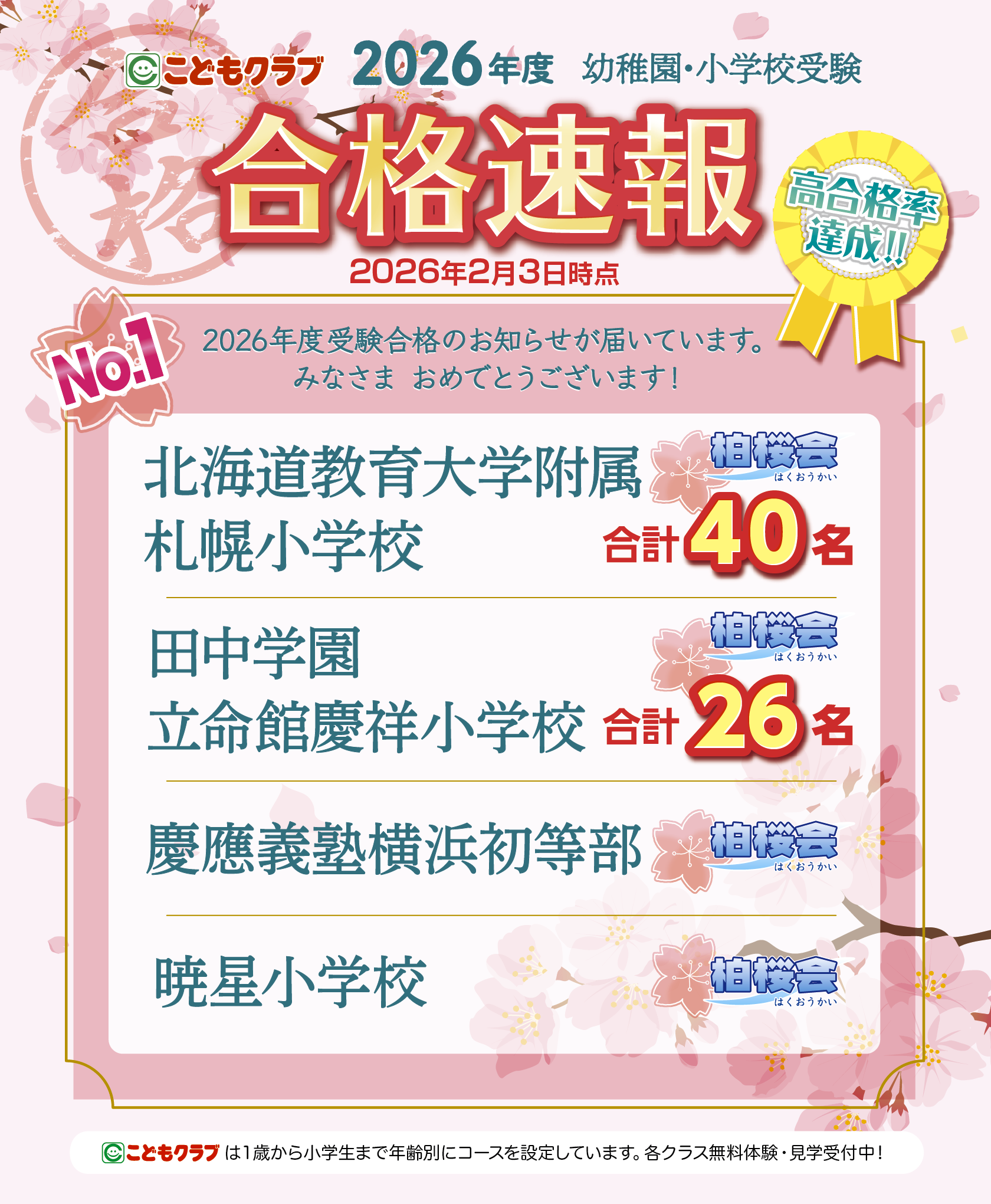 札幌駅前教室では、2026年度4月開講予定の柏桜会・年少クラス、年中クラスの体験会を開催します!この機会にお教室にいらしてみませんか?