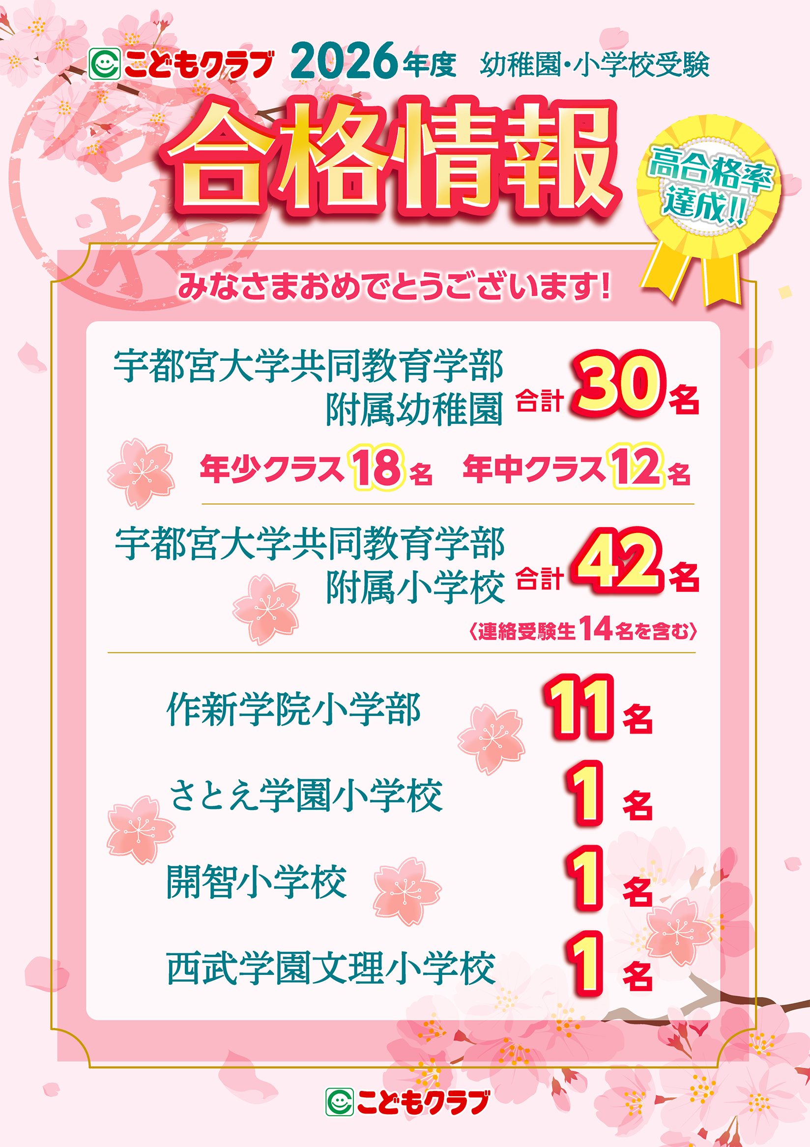 教室にお通いの多くのお子様が合格をいただきました。